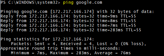 PS C:\WINDOWS\system32> ping google.com Pinging google.com [172.217.166.174] with 32 bytes of data: Reply from 172.217.166.174: bytes=32 time=30ms TTL=55 Ping statistics for 172.217.166.174: Packets: Sent = 1, Received = 1, Lost = 0 (0% loss), Approximate round trip times in milli-seconds: Minimum = 30ms, Maximum = 30ms, Average = 30ms Control-C PS C:\WINDOWS\system32> $LASTEXITCODE -1073741510 PS C:\WINDOWS\system32> $? True