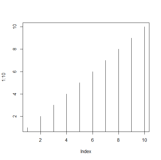type = "h" 是 base R 中的一個繪圖引數,通常用在 plot 函式中。它有助於在 R 環境中生成垂直線,而不是點。例如,如果我們想繪製 1 到 10 的值,那麼 type = "h" 將繪製從 X 軸開始的垂直線,而線的上端將表示實際值。