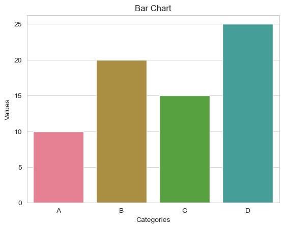 在此示例中,'sns.barplot()' 使用 Seaborn 建立條形圖。以下幾行使用 Matplotlib 設定 x 軸標籤、y 軸標籤和標題。最後,'plt.show()' 顯示繪圖。