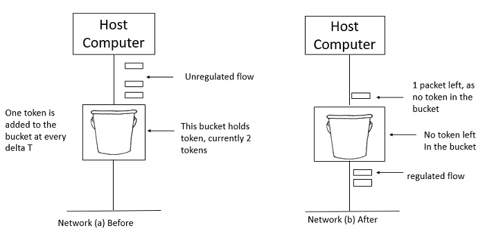 在圖 (a) 中,桶包含兩個令牌,並且三個資料包正在等待從介面傳送出去。