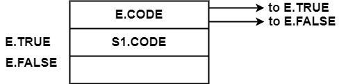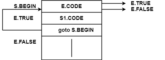 建立一個指向 E 的第一個指令的標籤 S. BEGIN。標籤 E.TRUE 附加到 S1 的第一個指令。如果 E 為真,控制將跳轉到標籤 E.TRUE 並執行 S1.CODE。如果 E 為假,控制將跳轉到 E.FALSE。在 S1.CODE 之後,控制將再次跳轉到 S. BEGIN,這將再次檢查 E.CODE 是否為真或假。