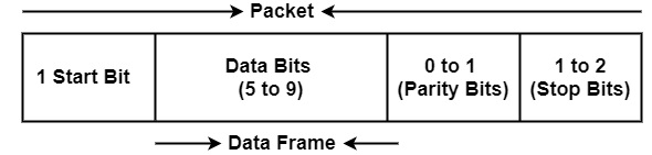 在這種通訊中,存在兩種型別的UART,例如傳送UART和接收UART,這兩種UART之間的通訊可以由彼此明確地完成。UART的資料傳輸可以透過微控制器、記憶體、CPU等其他裝置以並行形式使用資料匯流排來完成。在從匯流排接收並行資料後,它透過插入起始位、停止位和奇偶校驗位等三個位來形成資料包。它逐位讀取資料包並將其接收到的資料轉換為並行形式以去除資料包的三個位。