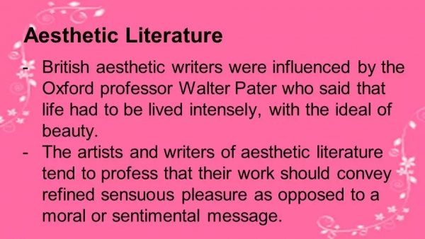 唯美主義:沃爾特·佩特是“為藝術而藝術”背後的男人,奧斯卡·王爾德也提倡這種觀點,其痕跡可以在他們的著作中找到。他根據藝術的道德和教育價值來評價藝術,因此他的寫作也與藝術相關。