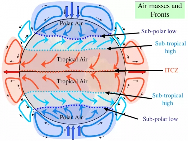 上圖顯示了由於地球向東自轉而導致的全球空氣流動。如果地球朝相反方向旋轉,上圖中顯示的所有這些氣流也將沿與其當前路徑相反的方向流動。