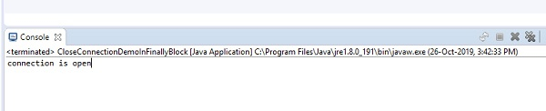 你需要關閉最終區塊中的連線。以下是關閉 JDBC 和 MySQL 中連線的 Java 程式碼 −