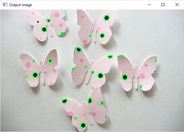 透過使用cv2.findContours()方法,我們成功地檢測到了蝴蝶影像上的25個黑點。檢測到的黑點以綠色突出顯示。