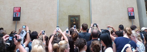 歐洲 法國 巴黎 時尚 盧浮宮博物館 內部 蒙娜麗莎 畫作 達芬奇 手機 法式古典遺產 建築 地標。
