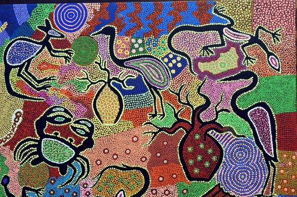 澳大利亞土著的點畫藝術作品。在土著澳大利亞藝術被創作在畫布上之前,土著人民會將土壤抹平以繪製神聖的儀式圖案。