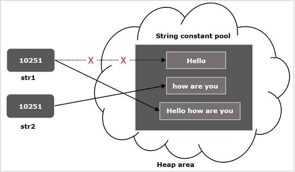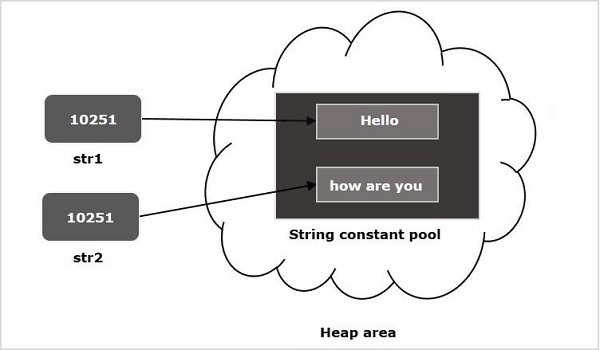 每當你定義一個字串值時,JVM 都會在字串常量池中建立一個具有給定值的字串物件。因此,如果你執行上面的程式,將在字串常量池中建立兩個字串值。