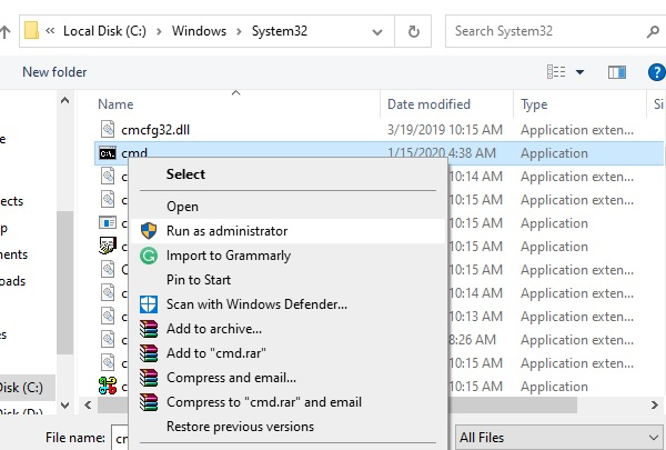 現在,將選擇更改為“所有檔案”,並搜尋 cmd.exe。現在右鍵單擊它並選擇“以管理員身份執行”。