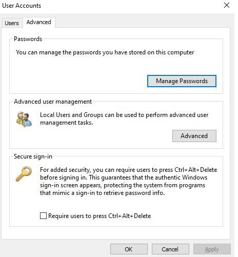 首先,在 Windows 執行提示符中輸入 netplwiz.exe,選擇“高階”選項卡,如下所示: