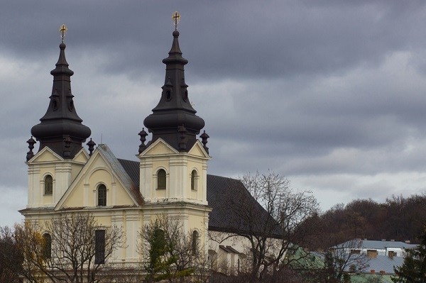 烏克蘭利沃夫,在陰雲密佈的天空背景下,一座加爾默羅會天主教堂