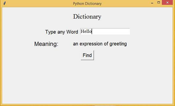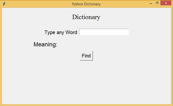 執行以上程式碼將建立並顯示字典應用程式。但是,使用PyDictionary,我們可以新增其他屬性,如查詢同義詞、反義詞等。