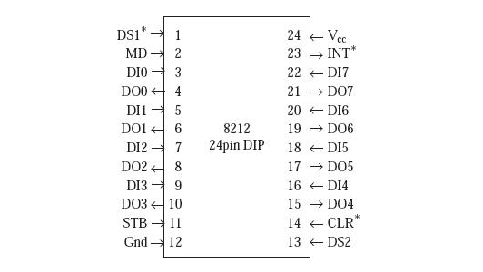 我們發現現在 8212 作為雙列直插式封裝晶片提供,共有 24 個引腳。下面是其功能引腳圖。