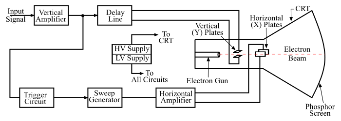陰極射線管 (CRT) – CRT 顯示正在測量的量。它產生並加速電子束,偏轉電子束以建立影像,幷包含一個熒光屏,電子束最終在該熒光屏上變得可見。