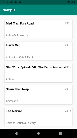 <?xml version="1.0" encoding="utf-8"?> <androidx.cardview.widget.CardView xmlns:android="http://schemas.android.com/apk/res/android" android:layout_width=" match_parent" android:layout_height="100dp" android:layout_margin="8dp"> <RelativeLayout android:layout_width="match_parent" android:layout_height="match_parent" android:padding="8dp"> <TextView android:id="@+id/title" android:layout_width="match_parent" android:layout_height="wrap_content" android:layout_alignParentStart="true" android:layout_toStartOf="@+id/year" android:textColor="#222222" android:textSize="16sp" android:textStyle="bold" /> <TextView android:id="@+id/year" android:layout_width="wrap_content" android:layout_height="wrap_content" android:layout_alignParentEnd="true" android:textColor="#999999" /> <TextView android:id="@+id/genre" android:layout_width="match_parent" android:layout_height="wrap_content" android:layout_alignParentBottom="true" /> </RelativeLayout> </androidx.cardview.widget.CardView>