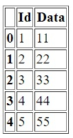 pandas.html <table border="1" class="dataframe"> <thead> <tr style="text-align: right;"> <th></th> <th>Id</th> <th>Data</th> </tr> </thead> <tbody> <tr> <th>0</th> <td>1</td> <td>11</td> </tr> <tr> <th>1</th> <td>2</td> <td>22</td> </tr> <tr> <th>2</th> <td>3</td> <td>33</td> </tr> <tr> <th>3</th> <td>4</td> <td>44</td> </tr> <tr> <th>4</th> <td>5</td> <td>55</td> </tr> </tbody> </table>