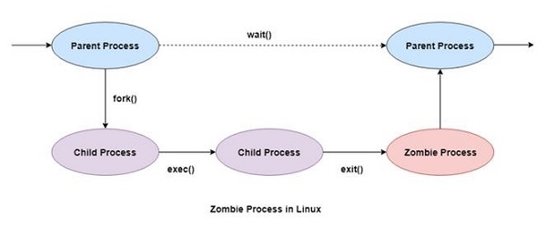 殭屍程序是指執行已完成但仍在程序表中保留條目的程序。殭屍程序通常發生在子程序中,因為父程序仍然需要讀取其子程序的退出狀態。一旦使用 wait 系統呼叫完成此操作,殭屍程序就會從程序表中刪除。這被稱為“回收”殭屍程序。